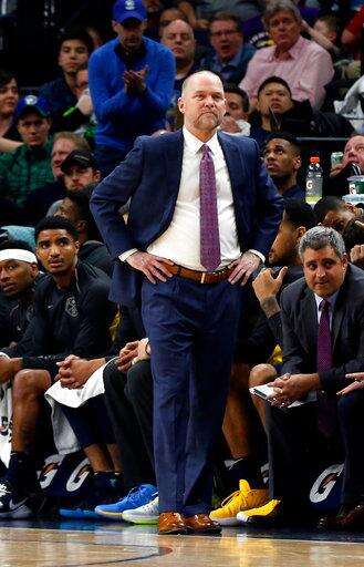 Denver Nuggets coach Michael Malone watches his team during the second half of an NBA basketball game against the Minnesota Timberwolves on Wednesday, April 11, 2018, in Minneapolis. The Timberwolves won 112-106 in overtime. (AP Photo/Jim Mone) The Associated Press