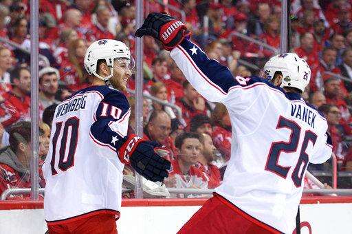 Columbus Blue Jackets center Alexander Wennberg (10) celebrates his goal with left wing Thomas Vanek (26) during the second period in Game 1 of an NHL first-round hockey playoff series against the Washington Capitals, Thursday, April 12, 2018, in Washington. (AP Photo/Nick Wass)