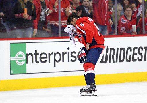 Washington Capitals defenseman Michal Kempny leaves the game with an injury during the first period in Game 1 of an NHL first-round hockey playoff series against the Columbus Blue Jackets, Thursday, April 12, 2018, in Washington. (AP Photo/Nick Wass)