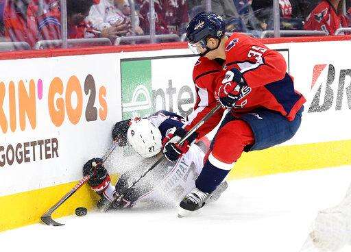 Columbus Blue Jackets defenseman Ryan Murray (27) crashes into the boards against Washington Capitals right wing Alex Chiasson (39) during the first period in Game 1 of an NHL first-round hockey playoff series Thursday, April 12, 2018, in Washington. (AP Photo/Nick Wass)