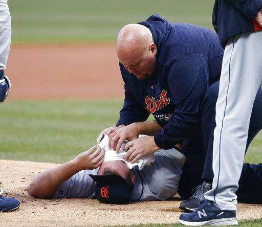Detroit Tigers starting pitcher Jordan Zimmermann is tended to by head athletic trainer Doug Teter after getting hit by a ball off the bat of Cleveland Indians' Jason Kipnis during the first inning in a baseball game Wednesday, April 11, 2018, in Cleveland. (AP Photo/Ron Schwane) The Associated Press