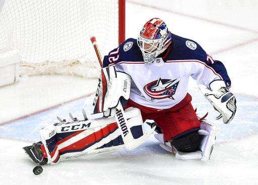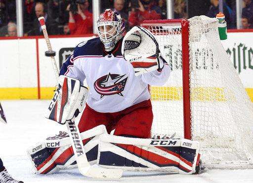 Columbus Blue Jackets goaltender Sergei Bobrovsky (72), of Russia, stops the puck during overtime in Game 2 of an NHL first-round hockey playoff series, Sunday, April 15, 2018, in Washington. The Blue Jackets won 5-4 in overtime. (AP Photo/Nick Wass)