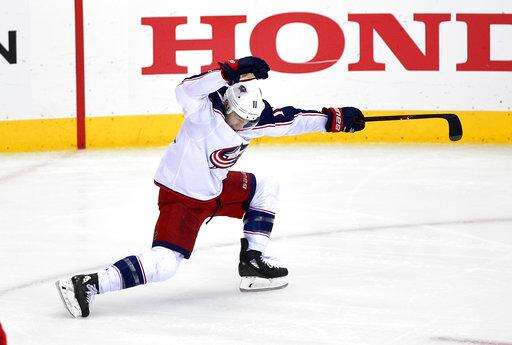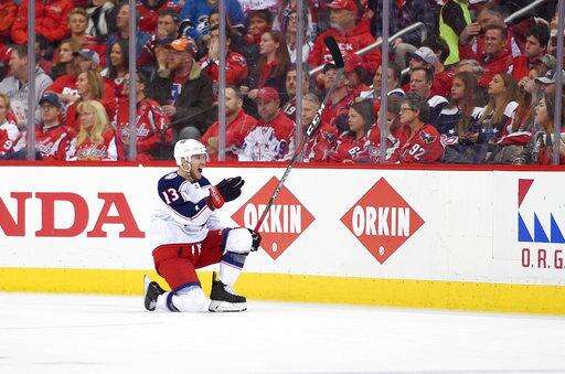 Columbus Blue Jackets left wing Matt Calvert (11) celebrates his game-winning goal in overtime in Game 2 of an NHL first-round hockey playoff series against the Washington Capitals, Sunday, April 15, 2018, in Washington. The Blue Jackets won 5-4 in overtime. (AP Photo/Nick Wass)