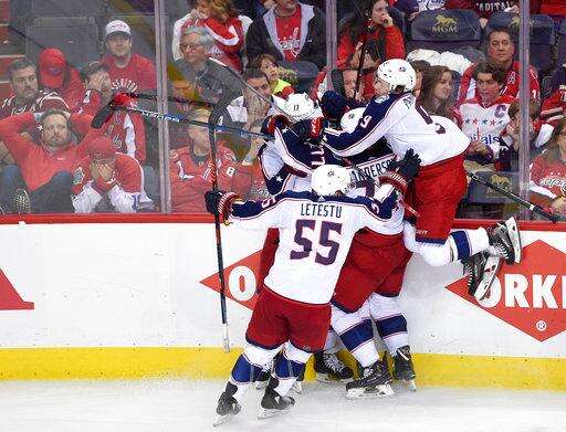 Columbus Blue Jackets left wing Matt Calvert, obscured, celebrates his game-winning goal with Artemi Panarin (9), Mark Letestu (55), Josh Anderson (77), Brandon Dubinsky (17) during overtime in Game 2 of an NHL first-round hockey playoff series against the Washington Capitals, Sunday, April 15, 2018, in Washington. The Blue Jackets won 5-4 in overtime. (AP Photo/Nick Wass)