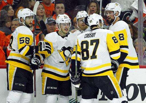 Pittsburgh Penguins' Sidney Crosby celebrates his goal with teammates during the first period in Game 3 of an NHL first-round hockey playoff series against the Philadelphia Flyers, Sunday, April 15, 2018, in Philadelphia, Pa. (AP Photo/Tom Mihalek) The Associated Press