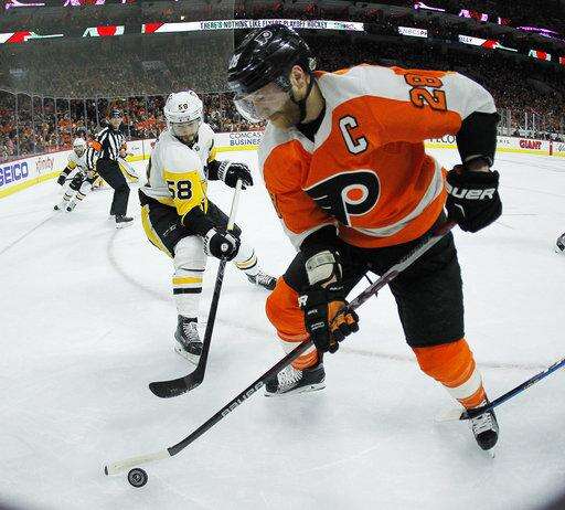 Philadelphia Flyers' Claude Giroux, right, gains control of the puck from Pittsburgh Penguins' Kris Letang, left, during the second period in Game 3 of an NHL first-round hockey playoff series Sunday, April 15, 2018, in Philadelphia, Pa. The Penguins won 5-1. (AP Photo/Tom Mihalek) The Associated Press