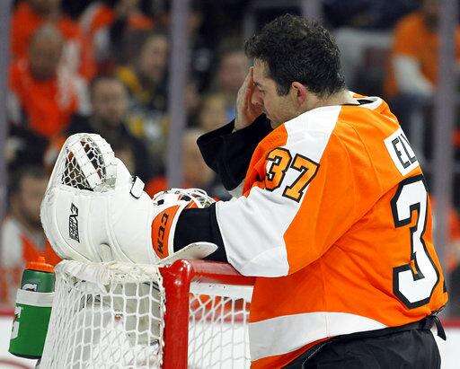 Philadelphia Flyers' Brian Elliott, wipes his face during a break in the action after the Pittsburgh Penguins scored a goal during the third period in Game 3 of an NHL first-round hockey playoff series Sunday, April 15, 2018, in Philadelphia, Pa. (AP Photo/Tom Mihalek) The Associated Press