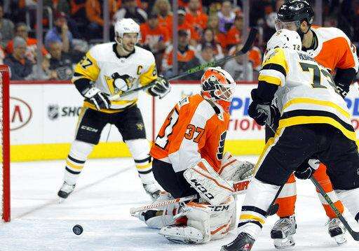 The puck bounces back out of the net behind Philadelphia Flyers goalie Brian Elliott after Pittsburgh Penguins' Justin Schultz, not pictured, scored a power play goal during the third period in Game 3 of an NHL first-round hockey playoff series Sunday, April 15, 2018, in Philadelphia, Pa. The Penguins won 5-1. (AP Photo/Tom Mihalek) The Associated Press