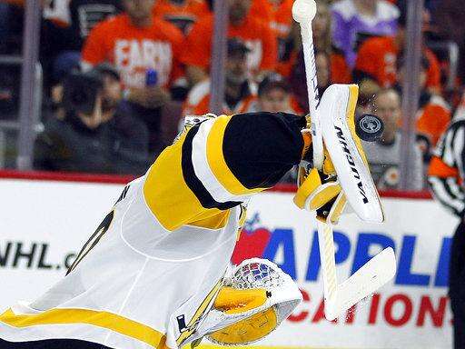 Pittsburgh Penguins goalie Matthew Murray uses his blocker to deflect a shot on goal by the Philadelphia Flyers during the second period in Game 3 of an NHL first-round hockey playoff series Sunday, April 15, 2018, in Philadelphia, Pa.. The Penguins won 5-1. (AP Photo/Tom Mihalek) The Associated Press
