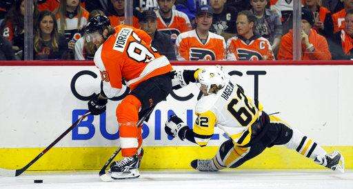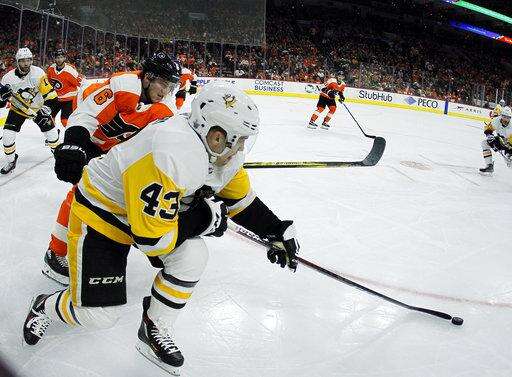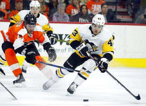 Philadelphia Flyers' Travis Sanheim, left, chases Pittsburgh Penguins' Conor Sheary, right, who controls the pucks during the second period in Game 3 of an NHL first-round hockey playoff series Sunday, April 15, 2018, in Philadelphia, Pa. The Penguins won 5-1. (AP Photo/Tom Mihalek) The Associated Press