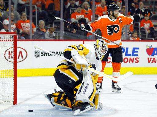 Philadelphia Flyers' Claude Giroux, back right, raises his arms after a shot by Travus Sanheim (not shown) got past Pittsburgh Penguins goalie Matthew Murray, left, for a goal during the second period in Game 3 of an NHL first-round hockey playoff series Sunday, April 15, 2018, in Philadelphia, Pa. (AP Photo/Tom Mihalek) The Associated Press