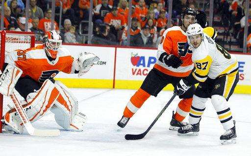 Pittsburgh Penguins' Sidney Crosby, right, positions himself in front of the net and Philadelphia Flyers goalie Brian Elliott, left, and Ivan Provorov during the second period in Game 3 of an NHL first-round hockey playoff series Sunday, April 15, 2018, in Philadelphia, Pa. (AP Photo/Tom Mihalek) The Associated Press