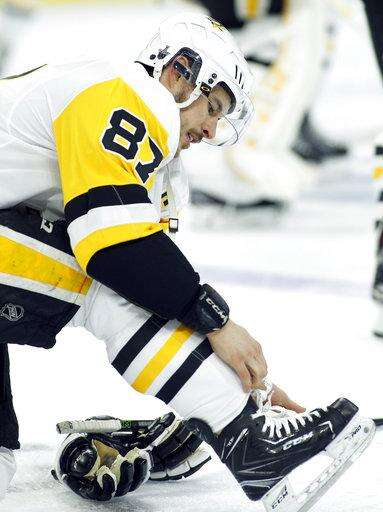 Pittsburgh Penguins' captain Sidney Crosby tightens the laces on his skates during warmups before Game 3 of an NHL first-round hockey playoff series against the Philadelphia Flyers, Sunday, April 15, 2018, in Philadelphia, Pa. (AP Photo/Tom Mihalek) The Associated Press