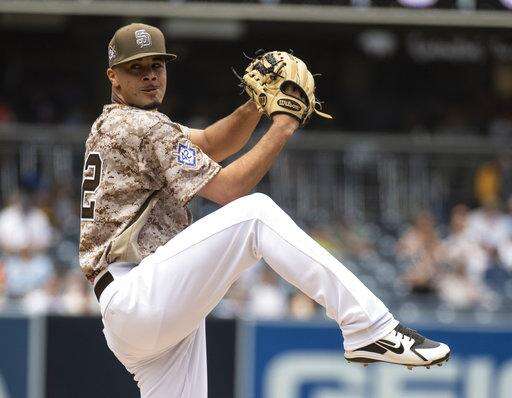 San Diego Padres starting pitcher Joey Lucchesi delivers during the first inning of a baseball game against the San Francisco Giants in San Diego, Sunday, April, 15, 2018. (AP Photo/Kyusung Gong) The Associated Press