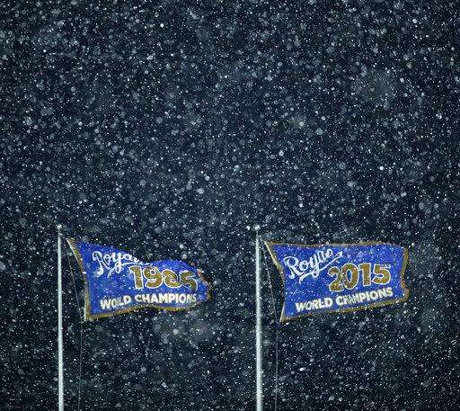 Flags fly as snow falls during the eighth inning of a baseball game between the Kansas City Royals and the Los Angeles Angels, Saturday, April 14, 2018, in Kansas City, Mo. (AP Photo/Charlie Riedel) The Associated Press