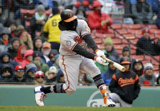 Baltimore Orioles' Manny Machado hits an RBI-double off a pitch by Boston Red Sox's Chris Sale in the first inning of a baseball game Sunday, April 15, 2018, in Boston. (AP Photo/Steven Senne) The Associated Press