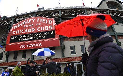 Fans do their best to stay warm and dry outside Wrigley Field after a baseball game between the Atlanta Braves and the Chicago Cubs was postponed on Sunday, April 15, 2018, in Chicago. The game is rescheduled for Monday, May 14, 2018. (AP Photo/Matt Marton) The Associated Press