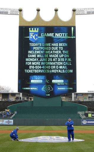 Grounds crew workers cover the pitcher's mound after a baseball game between the Kansas City Royals and the Los Angeles Angels was postponed due to inclement weather Sunday, April 15, 2018, in Kansas City, Mo. (AP Photo/Charlie Riedel) The Associated Press
