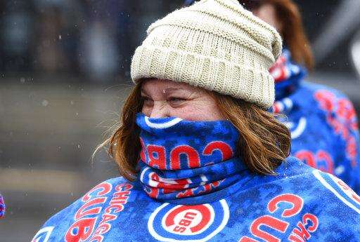 Barb Brauer keeps herself warm outside Wrigley Field after a baseball game between the Atlanta Braves and the Chicago Cubs was postponed on Sunday, April 15, 2018, in Chicago. The game is rescheduled for Monday, May 14, 2018. (AP Photo/Matt Marton) The Associated Press
