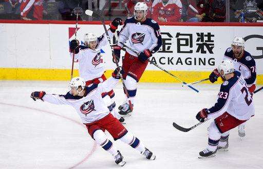 Columbus Blue Jackets left wing Artemi Panarin, front, of Russia, celebrates his game-winning goal with Cam Atkinson (13), Nick Foligno (71), Ian Cole (23) and Pierre-Luc Dubois (18) during overtime in Game 1 of an NHL first-round hockey playoff series against the Washington Capitals, Thursday, April 12, 2018, in Washington. The Blue Jackets won 4-3. (AP Photo/Nick Wass) The Associated Press