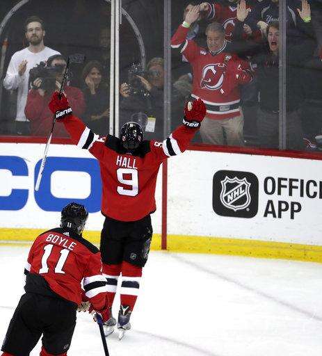 NEWARK, N.J. (AP) - With the New Jersey Devils' first playoff appearance since 2012 starting to look like an early exit, Taylor Hall came up big - just like he has done all season.