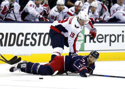 Washington Capitals forward Nicklas Backstrom, top, of Sweden, knocks down Columbus Blue Jackets forward Nick Foligno during the first period in Game 3 of an NHL first-round hockey playoff series in Columbus, Ohio, Tuesday, April 17, 2018. (AP Photo/Paul Vernon) The Associated Press