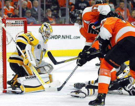 Pittsburgh Penguins goalie Matthew Murray, left, stops a shot as Philadelphia Flyers' Wayne Simmonds, center, and Nolan Patrick, look for a rebound during the second period in Game 4 of an NHL first-round hockey playoff series Wednesday, April 18, 2018, in Philadelphia. (AP Photo/Tom Mihalek) The Associated Press