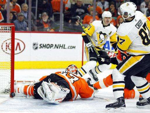 The puck bounces back out behind Philadelphia Flyers goalie Brian Elliott on a power-play goal by Pittsburgh Penguins' Evgeni Malkin (71) as Sidney Crosby, right, watches during the first period in Game 4 of an NHL first-round hockey playoff series Wednesday, April 18, 2018, in Philadelphia. (AP Photo/Tom Mihalek) The Associated Press