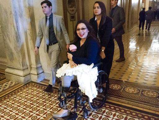 Sen. Tammy Duckworth, D-Ill., arrives at the Capitol for a vote with her new daughter, Maile, bundled on her lap, in Washington, Thursday, April 19, 2018. In an historic change in Senate rules, the lawmakers decided to allow babies of members on the floor during votes. (AP Photo/J. Scott Applewhite) The Associated Press