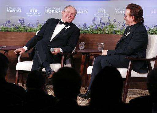 Former President George W. Bush, left, and U2 musician Bono participate in a Q&A session during a gala for the Forum on Leadership at the George W. Bush Institute, Thursday, April 19, 2018, in Dallas. (AP Photo/Brandon Wade)