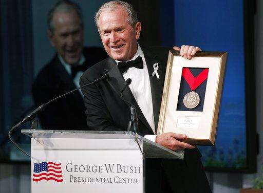 CORRECTS TO LEADERSHIP, NOT CITIZENSHIP - Former President George W. Bush presents a medal of Distinguished Leadership to U2 musician Bono during a gala for the Forum on Leadership at the George W. Bush Institute, Thursday, April 19, 2018, in Dallas. (AP Photo/Brandon Wade)