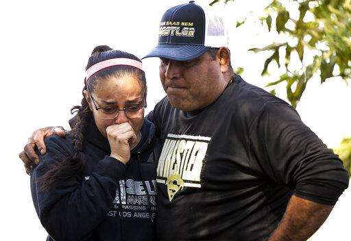 Wrestling coach Ray Castellanos, right, and assistant coach, Monique Cabrera, left, mourn at the site where their South El Monte High School athlete, Jeremy Sanchez, a 17-year-old was fatally stabbed by a teenage friend, in South El Monte, Calif., Thursday, April 19, 2018. Los Angeles County sheriff's investigators say a 16-year-old was arrested on suspicion of murder. (AP Photo/Damian Dovarganes) The Associated Press