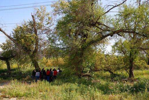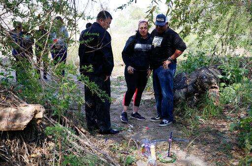 Family members gather in a circle of prayer on the riverbed for South El Monte High School athlete, Jeremy Sanchez, a 17-year-old, who was fatally stabbed by a teenage friend, in South El Monte, Calif., Thursday, April 19, 2018. Los Angeles County sheriff's investigators say a 16-year-old was arrested on suspicion of murder. (AP Photo/Damian Dovarganes) The Associated Press
