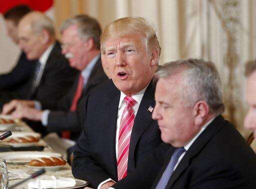 President Donald Trump speaks to members of the media during a working lunch with Japanese Prime Minister Shinzo Abe, at Trump's private Mar-a-Lago club, Wednesday, April 18, 2018, in Palm Beach, Fla. (AP Photo/Pablo Martinez Monsivais)