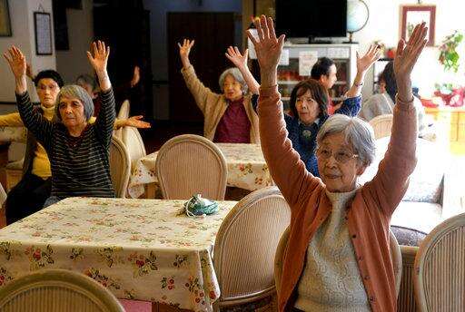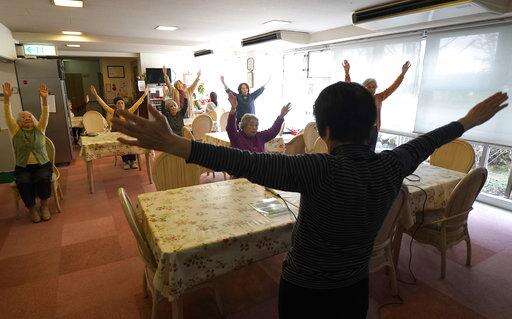 In this March 13, 2018, photo, aged people do exercises at Silver Villa Koyama, a home for the aged, in Tokyo. Though Silver Villa is ranked as among the best, nursing homesâ services often prove disappointing. Many people are opting for their own private solutions of living on their own, while getting relatively cheap help with cleaning, cooking and deliveries. Five million of Japanâs 35 million people 65 and older are estimated to live in special-care facilities, according to the Health Ministry. (AP Photo/Shizuo Kambayashi)