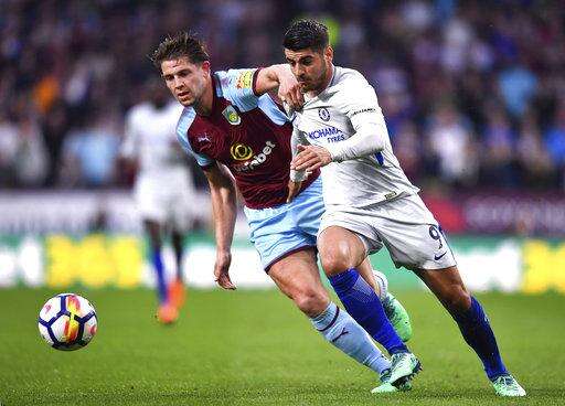 Burnley's James Tarkowski, left, chases the ball with Chelsea's Alvaro Morata during the English Premier League soccer match at Turf Moor, in Burnley, England, Thursday April 19, 2018.(Anthony Devlin/PA via AP) The Associated Press