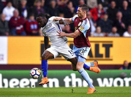 Chelsea's Victor Moses, left, and Burnley's Stephen Ward, during the English Premier League soccer match at Turf Moor, in Burnley, England, Thursday April 19, 2018.(Anthony Devlin/PA via AP) The Associated Press