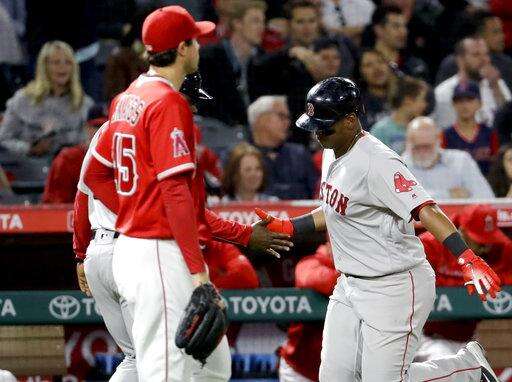 Boston Red Sox's Rafael Devers, right, is congratulated after his grand slam off Los Angeles Angels starting pitcher Tyler Skaggs during the third inning of a baseball game in Anaheim, Calif., Wednesday, April 18, 2018. (AP Photo/Chris Carlson) The Associated Press