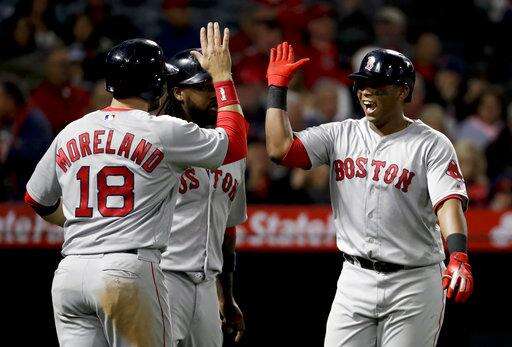 Boston Red Sox's Rafael Devers, right, celebrates his grand slam with Mitch Moreland during the third inning of a baseball game against the Los Angeles Angels in Anaheim, Calif., Wednesday, April 18, 2018. (AP Photo/Chris Carlson) The Associated Press