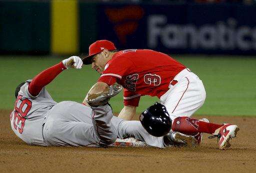 Boston Red Sox's Eduardo Nunez, left, gets tagged out at second by Los Angeles Angels second baseman Ian Kinsler while trying to advance after a single during the fifth inning of a baseball game in Anaheim, Calif., Wednesday, April 18, 2018. (AP Photo/Chris Carlson) The Associated Press