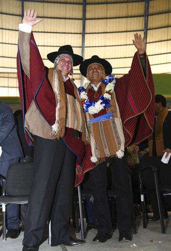 In this May 26, 2017 photo released by the government-run Bolivian Information Agency, Cuba's Miguel Diaz-Canel, left, and Bolivia's President Evo Morales raise their arms during the inauguration of a sports coliseum in Pucarani, Bolivia. One year later, on Thursday, April 19, 2018, Diaz-Canel became the new president of Cuba, after Raul Castro stepped down. (Reynaldo Zaconeta/Bolivian Information Agency via AP) The Associated Press
