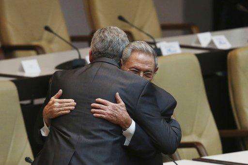 Cuba's new president Miguel Diaz-Canel, right, and former president Raul Castro embrace after Diaz-Canel was elected as the island nation's new president, at the National Assembly in Havana, Cuba, Thursday, April 19, 2018. Castro left the presidency after 12 years in office when the National Assembly approved Diaz-Canel's nomination as the candidate for the top government position. (Alexandre Meneghini/Pool via AP) The Associated Press