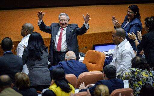 Outgoing President Raul Castro raises his arms in celebration after Miguel Diaz-Canel was elected as the island nation's new president, at the National Assembly in Havana, Cuba, Thursday, April 19, 2018. Castro passed Cuba's presidency to Diaz-Canel, putting the island's government in the hands of someone outside the Castro family for the first time in nearly six decades. He remains head of the powerful Communist Party that oversees political and social activities. (Adalberto Roque/Pool via AP) The Associated Press