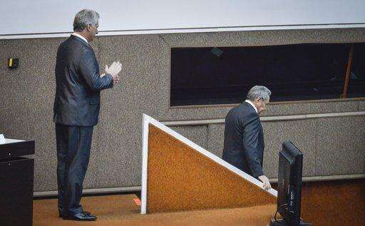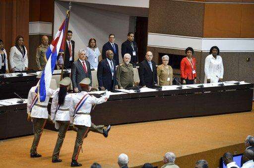 Cuba's new president Miguel Diaz-Canel, center, sits after being elected as the island nation's new president, at the National Assembly in Havana, Cuba, Thursday, April 19, 2018. Raul Castro left the presidency after 12 years in office when the National Assembly approved Diaz-Canel's nomination as the candidate for the top government position. (AP Photo/Desmond Boylan) The Associated Press