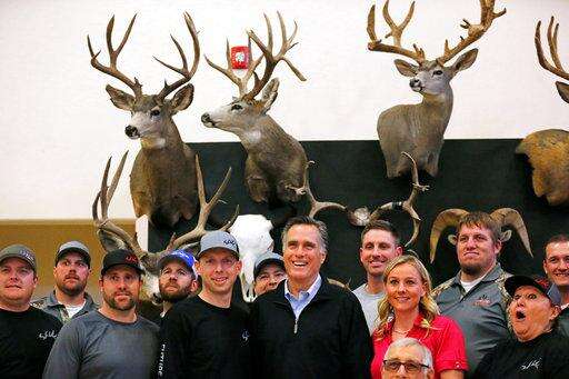 In this Friday, March 2, 2018 photo, Mitt Romney poses with a group at the Sportsmen for Fish and Wildlife Banquet during a campaign stop, in Blanding, Utah. Romney is gearing up for arguably the biggest challenge of his Senate campaign: A Utah Republican party convention where he'll have to face down nearly a dozen contenders in front of a far-right-leaning audience. (AP Photo/Rick Bowmer, File)