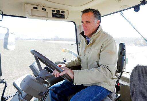 FILE - In this Feb. 16, 2018, file photo, shows former Republican presidential candidate Mitt Romney sitting behind the wheel of a tractor during a tour of Gibson's Green Acres Dairy in Ogden, Utah. Romney is gearing up for arguably the biggest challenge of his Senate campaign: A Utah Republican party convention where he'll have to face down nearly a dozen contenders in front of a far-right-leaning audience. (AP Photo/Rick Bowmer, File)'