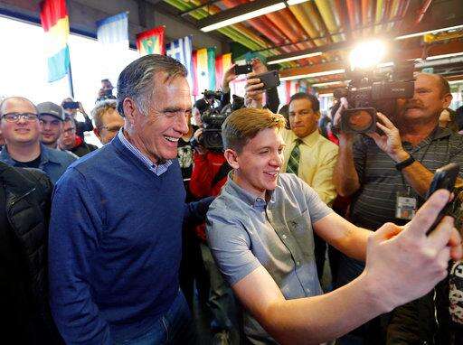 FILE - In this Feb. 16, 2018, file photo, former Republican presidential candidate Mitt Romney, left, poses for a photo as he greets students at Utah Valley University, in Orem, Utah. Romney is gearing up for arguably the biggest challenge of his Senate campaign: A Utah Republican party convention where he'll have to face down nearly a dozen contenders in front of a far-right-leaning audience. (AP Photo/Rick Bowmer, File)