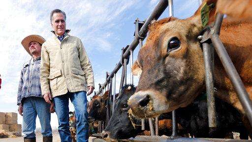 FILE - In this Feb. 16, 2018, file photo, shows former Republican presidential candidate Mitt Romney standing near cows during a tour of Gibson's Green Acres Dairy in Ogden, Utah. Romney is gearing up for arguably the biggest challenge of his Senate campaign: A Utah Republican party convention where he'll have to face down nearly a dozen contenders in front of a far-right-leaning audience. (AP Photo/Rick Bowmer, File)