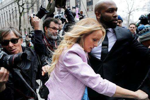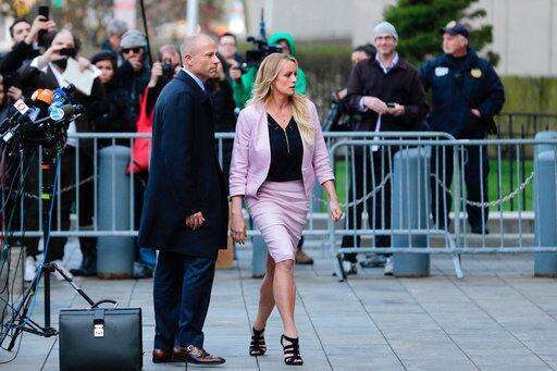 FILE - In this April 16, 2018, file photo, Stormy Daniels arrives at federal court in New York to attend a court hearing where a federal judge is considering how to review materials that the FBI seized from President Donald Trump's personal lawyer to determine whether they should be protected by attorney-client privilege. A federal judge is set to hear arguments about whether to delay the case of Daniels, who claims she had an affair with President Donald Trump, after federal agents raided the president's personal lawyer's office and residence. U.S. District Judge James Otto will hold the hearing Friday, April 20, in Los Angeles. (AP Photo/Seth Wenig, File)