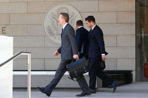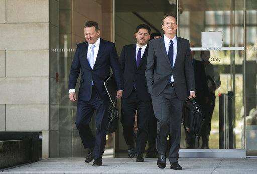 Attorney Brent Blakely, middle, who represents President Donald Trump's attorney Michael Cohen, walks with Trump attorneys Charles Harder, left, and Ryan Stonerock, right, as they leave U.S. District Court for the Central District of California after a hearing regarding adult-film actress Stephanie Clifford, also known as Stormy Daniels, in Los Angeles, Friday, April 20, 2018. A federal judge in Los Angeles has told Cohen's lawyers that he needs to file a declaration in court in order to delay a lawsuit filed by Daniels. (AP Photo/Damian Dovarganes)